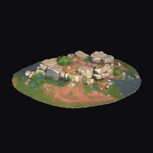 Perched atop a gentle slope, the rocky outcrop stands as a testament to the beauty of natural formations. The model’s intricate details reveal a complex arrangement of large and small stones, with some rocks stacked haphazardly, while others lie scattered across the terrain. The surface of the rocks is weathered, with visible textures that suggest the relentless passage of time. Lush greenery sprouts from the crevices and cracks, adding a burst of life to the otherwise rugged landscape. The surrounding terrain is a mix of dirt and grass, with the occasional small pebble or stone dotting the landscape. As the eye wanders across the model, it’s drawn to the interplay of light and shadow, which accentuates the three-dimensionality of the outcrop and its surroundings. This model is perfect for projects requiring a realistic outdoor setting, such as games, animations, or architectural visualizations.