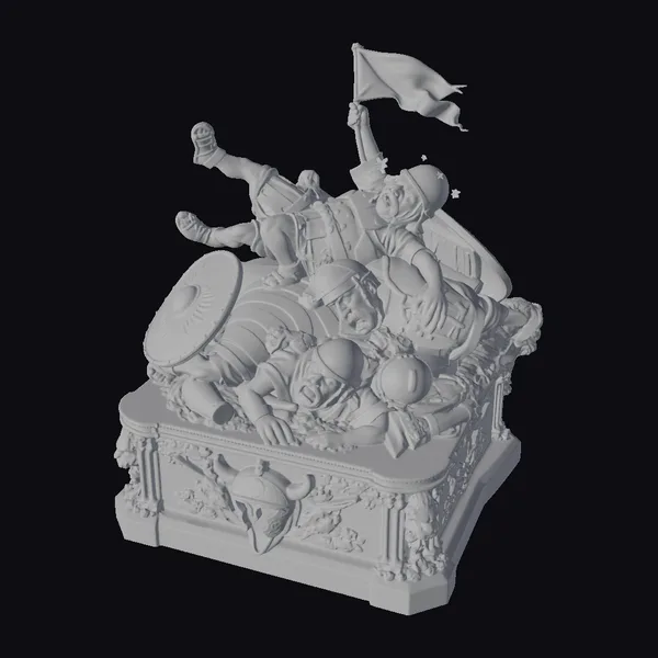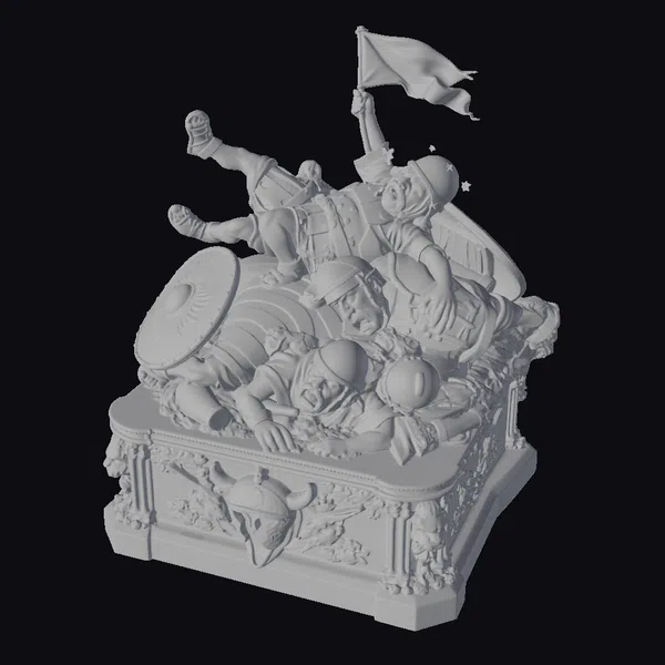 Crafted with meticulous attention to detail, this stylized model presents a dynamic scene of Roman soldiers in disarray, toppled from a decorative pedestal adorned with gold accents and military motifs. The soldiers’ armor, a mix of gray and earth tones, contrasts with the vibrant gold of the pedestal, creating a visually striking image. Each soldier’s facial expression and body language conveys a sense of surprise and desperation, inviting the viewer to ponder the story behind their downfall. This model is perfect for projects requiring a blend of historical essence and artistic liberty, such as animations, games, or architectural visualizations that seek to evoke a sense of ancient drama.