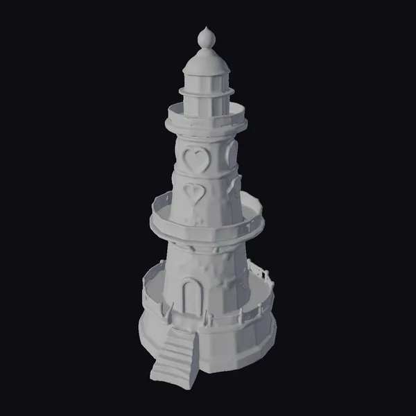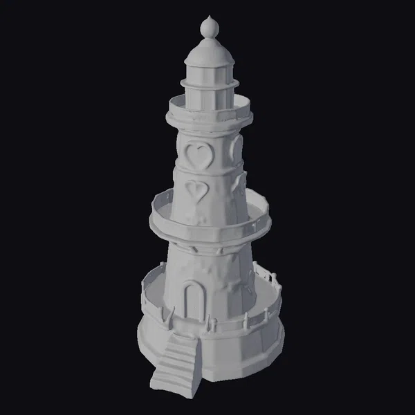 This picturesque lighthouse boasts a unique, stylized design, with a slender tower rising from a broad base. The rose-gold stonework is adorned with a delicate, marbled pattern, giving the structure a sense of elegance and sophistication. A heart-shaped beacon crowns the lighthouse, while a small staircase leads to a heart-shaped door, adding a touch of romance to the overall design. The coral-strewn shore provides a natural, rustic backdrop for this charming lighthouse. Ideal for use in games, animation, or design projects, this model is sure to add a touch of whimsy and charm. Its intricate details and stylized design make it perfect for creating a dreamy, fantastical atmosphere.