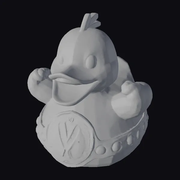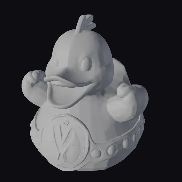 Detailed with precision, this stylized rubber duck stands out with its bright yellow hue and charming smile. The duck’s pose, with one hand raised in a triumphant gesture, adds to its playful demeanor. The championship belt, adorned with red and blue gems and a prominent gold plate featuring crossed objects, contrasts humorously with the duck’s carefree nature. Ideal for use in games, animations, or as a quirky decorative piece, this model brings a touch of whimsy and fun. Its high-quality design ensures crisp details and smooth surfaces, perfect for close-up views or dynamic scenes.