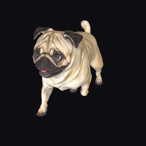 Sprinting towards fun, this adorable pug dog is captured in mid-stride, its little legs a blur as it darts across the scene. With a coat of warm tan fur and distinctive black accents on its ears, face, and paws, this 3D model exudes playful charm.