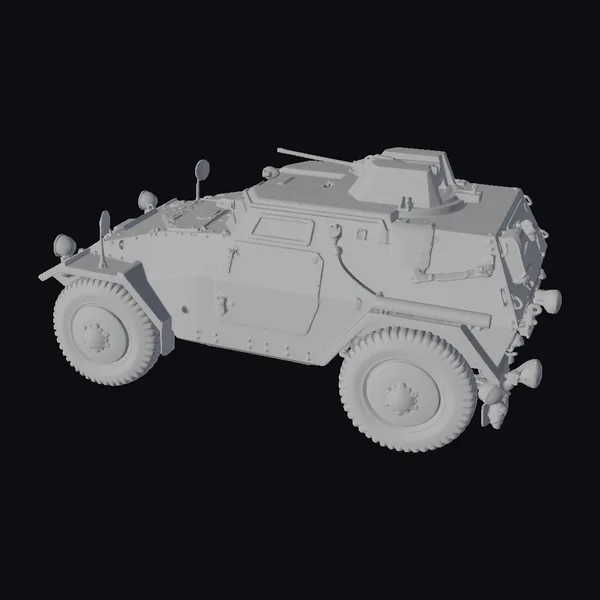 Perched on rugged tires with golden rims, this armored vehicle exudes a sense of rugged resilience. The weathered exterior, with its mottled grey and brown hues, tells a story of extensive use and exposure to the elements. A prominent gun protrudes from the top, flanked by various antennas and sensors, hinting at its former role in reconnaissance or combat. The vehicle’s design, marked by reinforced plating and narrow windows, underscores its original purpose: to protect its occupants from harm. Ideal for projects requiring a touch of realism and grit, such as historical dramas, war simulations, or post-apocalyptic narratives, this model is poised to add depth and authenticity.