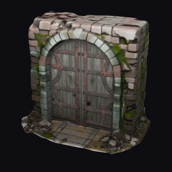 Step into a medieval world with this intricately detailed rustic fortress gate, complete with weathered stone walls, moss-covered arches, and a sturdy wooden door adorned with metal accents.