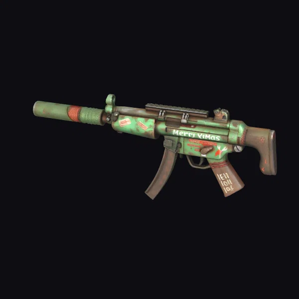 Detailed with a weathered, rustic finish, this stylized MP5 showcases a predominantly green body with splashes of red and brown, giving it a unique holiday twist. The ‘Merry Xmas’ text and holly patterns add a festive touch, making it a standout piece. Crafted with precision, the model features intricate textures and a robust build, perfect for projects requiring a firearm with a festive flair. Ideal for use in games, animations, or designs where a quirky, holiday-themed weapon is needed.