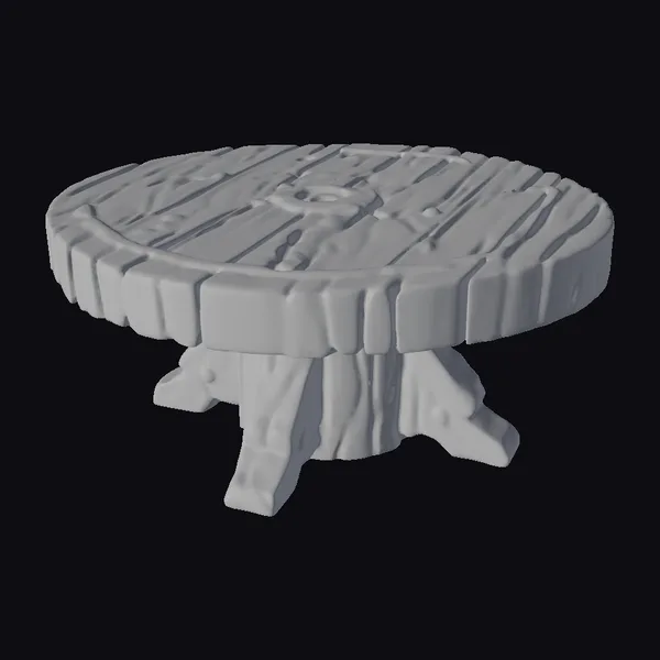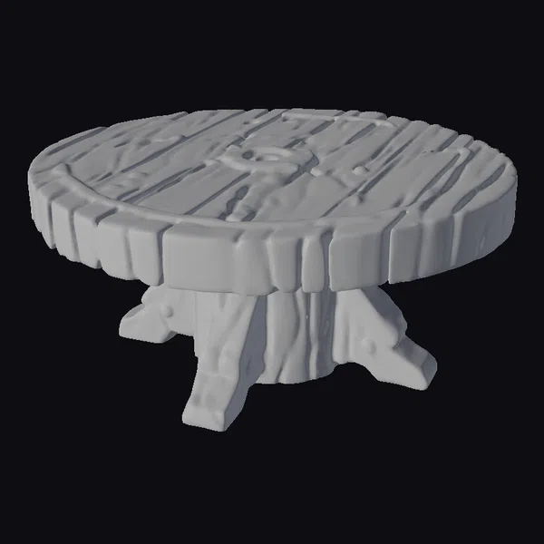 Perched on four sturdy legs, this rustic round wooden table boasts a thick, circular top with a distinctive rim, reminiscent of a tree trunk. The wooden planks that comprise the tabletop are meticulously detailed, with visible gaps between them adding to the piece’s rugged allure. A central knot on the tabletop draws the eye, while the legs, shaped like tree roots, provide a sturdy base. The entire piece is bathed in a warm, earthy tone, suggesting years of use and weathering. Ideal for adding a touch of medieval flair to games, animations, or architectural designs, this table promises to bring a sense of history and character to any setting.
