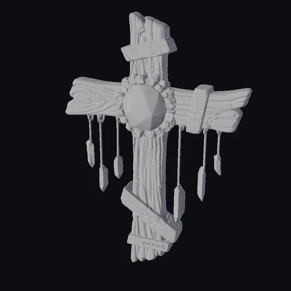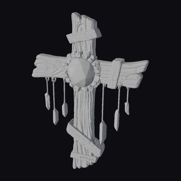 Crafted from dark, weathered timber, this rustic wooden cross showcases a dreamcatcher-like charm at its center. The deep purple gemstone, encircled by smaller crystals, seems to glow with an inner light. Delicate crystals dangle from the frame, adding a touch of whimsy and mysticism. The wooden frame itself features visible grain and rough chisel marks, lending an air of handcrafted authenticity. Ideal for those drawn to unique home decor or spiritual symbols, this piece can add a touch of rustic elegance to any room. Its intricate details and textures make it perfect for 3D printing, game development, or architectural visualization projects seeking a distinctive, handcrafted aesthetic.