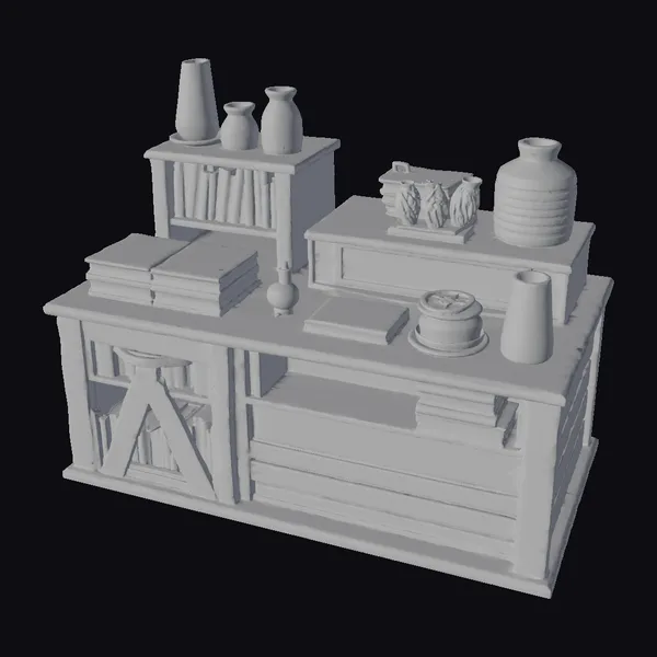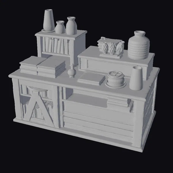 Perched on a sturdy wooden base, this rustic display presents an assortment of items that evoke a sense of history and comfort. The wooden surface is strewn with stacks of old, leather-bound books in various shades of brown and green. Earthy vases and jars in terracotta hues add a touch of natural elegance, while the wooden vases display a range of textures, from smooth to ridged. The furniture itself features a classic design with drawers and shelves, offering ample storage. The wooden grain is visible throughout, lending an organic feel to the piece. This 3D model is perfect for projects requiring a vintage or rustic aesthetic, such as historical animations, video game environments, or architectural visualizations.