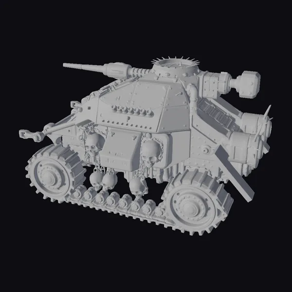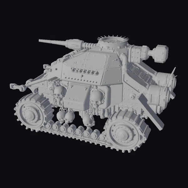Detailed with precision, this 1:60 scale land speeder model showcases a complex assembly of metallic parts, adorned with a menacing array of spikes and skulls. The rusted red and brown hues give it a battle-worn appearance, as if it’s been through a relentless war. The speeder’s design combines industrial and futuristic elements, featuring a crawler mechanism and railguns for firepower. Its imposing presence makes it perfect for sci-fi settings, video game assets, or cinematic projects. The model’s high level of detail, from the texture of its metal plates to the suspension of skulls along its tracks, offers ample opportunities for close-up shots or integration into various digital environments.