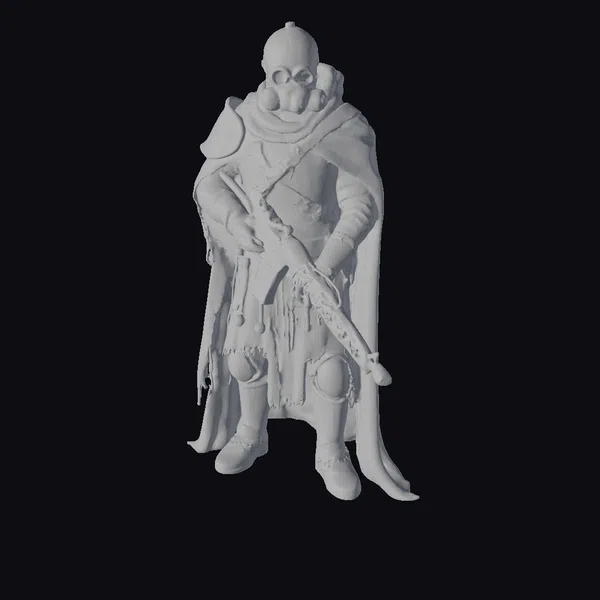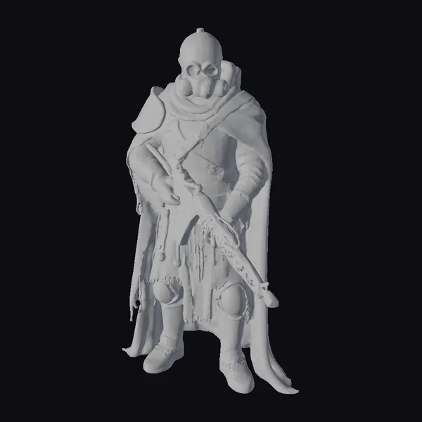 This imposing figure is clad in a mix of ancient and industrial armor, with a helmet that resembles a gas mask, complete with a hood and a flowing cape that drapes down to the ground. The armor itself is a patchwork of leather and metal, with visible rust and wear, suggesting a long history of battles fought. The warrior wields a large gun, its surface similarly weathered, adding to the overall aura of a world ravaged by conflict. The pose is confident, yet the tattered cape and the grimacing helmet suggest a readiness for battle in a desolate landscape. Ideal for projects set in dark fantasy or post-apocalyptic worlds, this model can bring depth and character to games, animations, or designs.