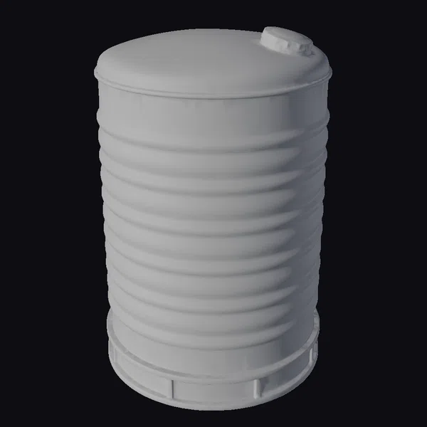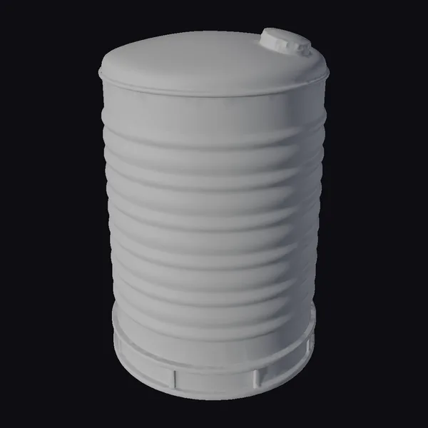 Positioned centrally, the blue metal drum stands with its lid securely fastened, showcasing a worn and weary appearance. The body’s horizontal ridges accentuate its cylindrical form, while rusty stains and corrosion marks hint at years of exposure to the elements. A small, circular indentation on the lid adds a touch of industrial authenticity. This drum’s realistic portrayal makes it an excellent choice for projects requiring a sense of grit and realism, such as industrial-themed environments, 3D animations, or architectural visualizations. Its detailed texture and coloration invite the viewer to imagine the stories behind its weathered exterior.