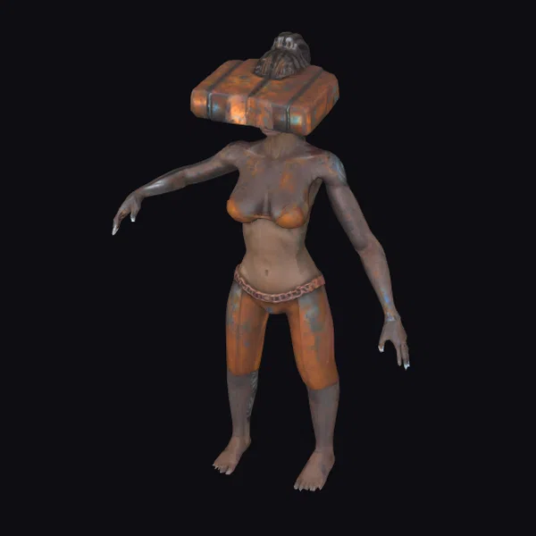 Standing with arms outstretched, this petite female cyborg presents a striking appearance. Her head, encased in a rusty metal box adorned with a smaller mechanical creature on top, draws immediate attention. The hyper-realistic textures covering her body blend seamlessly, highlighting the fusion of human skin and metallic components. Oiled metallic sheens add depth to her appearance, suggesting a blend of organic vitality and mechanical resilience. This model is perfect for projects requiring a unique, sci-fi character, such as animations, games, or virtual reality experiences, where detail and realism are paramount.