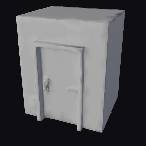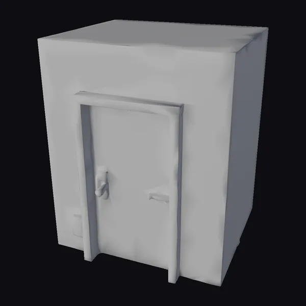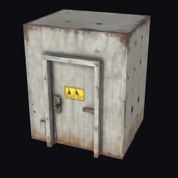 Perched on a slight angle, this metal safe box appears ready to safeguard its contents from the elements and prying eyes. The textured surface showcases faint grime streaks and rust spots, lending an air of authenticity to the design. A sturdy metal door frame surrounds a central locking mechanism, while a yellow warning sign with black graphics and text adds an air of caution. The box’s rugged appearance makes it perfect for use in industrial or sci-fi settings, where secure storage is paramount. Designers can utilize this model in 3D environments, animations, or even 3D printing projects, taking advantage of its detailed, realistic appearance.