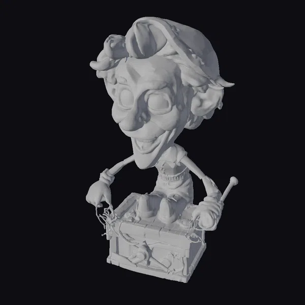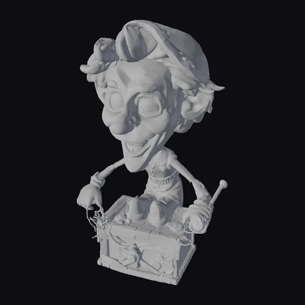 Perched atop a mechanical box, this puppet figure showcases intricate details such as a rusted cap, expressive facial features, and a tool in hand, suggesting a life of its own. The stylized character’s design combines a cartoonish appeal with a steampunk aesthetic, featuring metallic textures and a rustic color palette. The puppet’s pose and facial expression evoke a sense of joy and curiosity. Ideal for use in animation, games, or as a decorative piece, this model brings a touch of fantasy and whimsy to any project. Its unique design and detailed craftsmanship make it a standout addition to any collection.