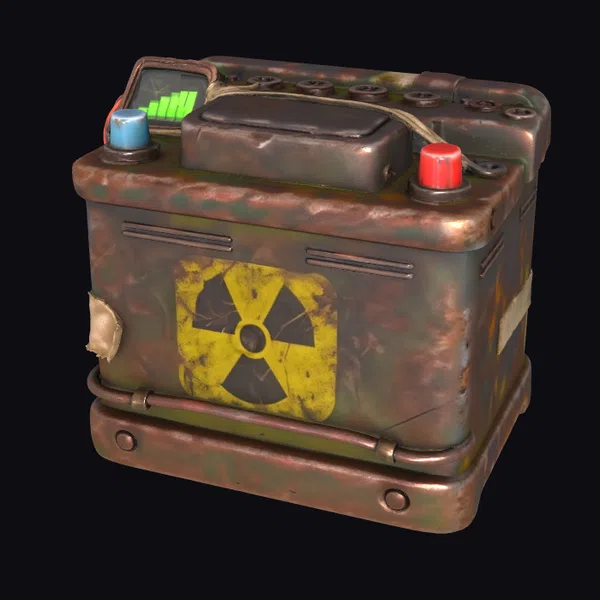 Perched at an angle, this weathered battery exudes an aura of neglect and decay. The metal exterior is a complex tapestry of rust and corrosion, with hints of its original surface barely visible beneath the grime. A small screen on the top-left corner flickers with a faint green light, casting an eerie glow on the surrounding rust. Two caps, one blue and one red, sit like sentinels on either side, their bright colors a jarring contrast to the dull, corroded body. The yellow radiation symbol on the front, though faded, still commands attention, a stark warning of the dangers within. This battery would be right at home in a post-apocalyptic game environment, a prop that tells a story of neglect and abandonment. Designers and artists can use it to add a touch of gritty realism to their projects, whether in games, animations, or architectural visualizations.
