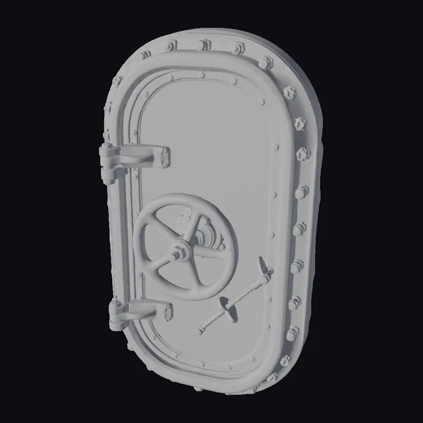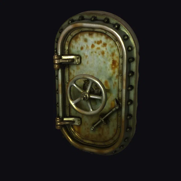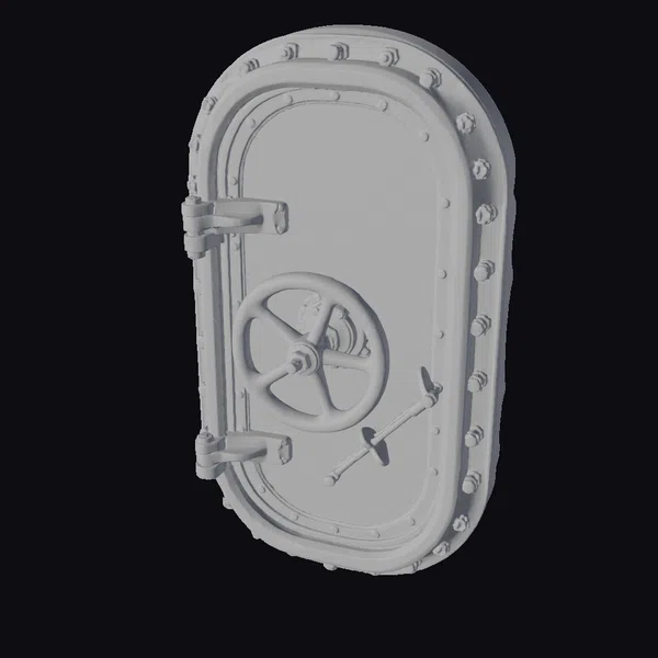 The intricate details of this submarine hatch door are on full display, from the raised bolts that line the perimeter to the worn, rusty wheel handle that looks like it’s been gripped by countless hands. The door’s surface is a masterclass in texture, with a mottled mix of grays and browns that evoke the feeling of damp, salty air. As light catches the metal, the rusty hues seem to shift and deepen, adding depth and visual interest. This model would be perfect for use in games, animation, or 3D printing projects that require a sense of industrial grit and realism.