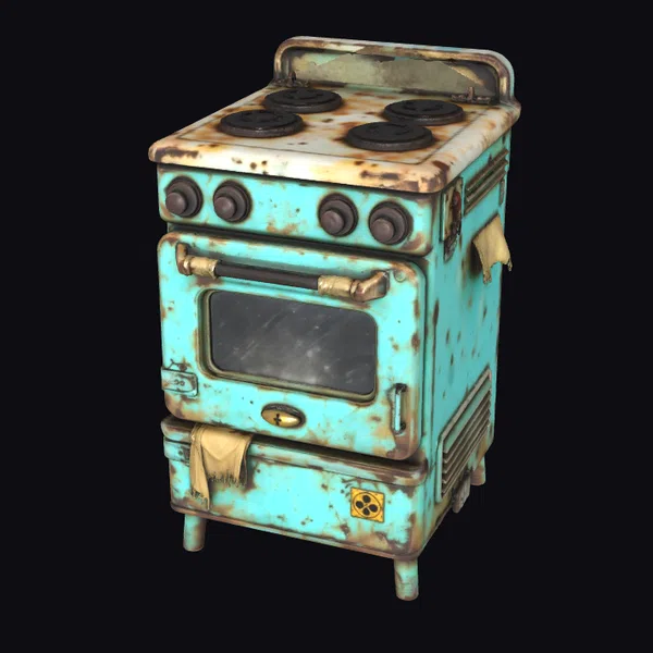 Positioned at an angle, the teal stove’s distressed finish is on full display. The body of the stove is a beautiful teal color, heavily worn and rusted in places, giving it a unique, battle-hardened look. Four black burners sit atop the stove, with four dials below them for controlling the heat. A large window on the oven door allows for a glimpse inside, while a biohazard symbol on the bottom drawer adds a touch of intrigue. The stove’s rugged appearance makes it perfect for projects requiring a vintage or industrial aesthetic. Designers and artists can use this model in games, 3D print it, or incorporate it into VR/AR experiences and animations.