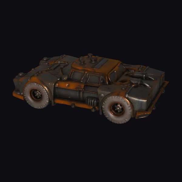 Positioned dynamically with a slight tilt, this stylized turbo car’s design is a feast for the eyes. The rusty brown and dark gray hues blend seamlessly, suggesting a vehicle that’s been through a lot. The thick, rugged tires are equipped with deep treads, implying a readiness for rough terrains. Industrial details such as pipes and bolts add to its complex, engineered look. The car’s bulky build and aggressive stance make it a compelling asset for projects needing a rugged, high-performance vehicle. Ideal for use in games, animations, or designs that demand a post-apocalyptic or industrial aesthetic.
