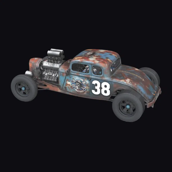Positioned dynamically, the vintage hot rod showcases its impressive design, from the detailed engine to the weathered paint job that peels back to reveal layers of history. The vehicle’s pose, with its wheels firmly on the ground and engine roaring, suggests movement and energy. Textures are rich and realistic, with rust and wear meticulously detailed, inviting the viewer to imagine the stories this car could tell. Its vibrant yet worn appearance makes it perfect for projects requiring a touch of nostalgia or a dash of rugged charm, whether in games, animation, or design.