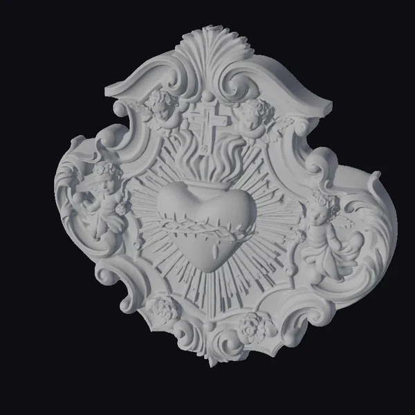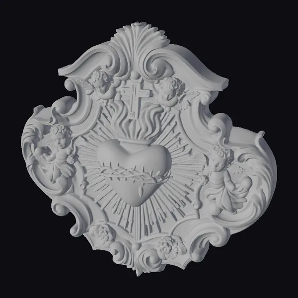 Intricately detailed and masterfully crafted, the Sacred Heart Relief Plaque presents a stunning visual feast. The central heart, encircled by flames and adorned with a crown of thorns, radiates a sense of passion and devotion. Two cherubs, positioned on either side, appear to be emerging from the ornate frame, adding a touch of playfulness and innocence. The golden cross at the top serves as a powerful symbol, while the surrounding floral patterns and swirling motifs evoke a sense of dynamic movement. This plaque is perfect for those seeking to add a touch of elegance and spirituality to their space. Its high level of detail and realistic texture make it an ideal choice for 3D printing, rendering, or animation projects.