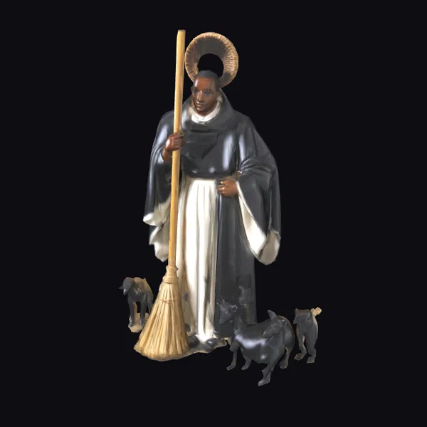 This meticulously crafted 3D model presents San Martin de Porres in a lifelike pose, capturing the essence of his devotion and compassion. The saint’s attire is rendered in exquisite detail, with the black robe and white undergarment hanging naturally from his form. A golden halo encircles his head, signifying his sainthood. The broom, a tool of his humility, is held firmly in his hand. At his feet, three small dogs—a monkey-like creature and two black dogs—seem to be interacting with each other, adding a dynamic element to the otherwise tranquil scene. The model’s textures and lighting create a realistic and immersive experience, making it suitable for various applications, including games, 3D printing, virtual reality, animation, and design projects.