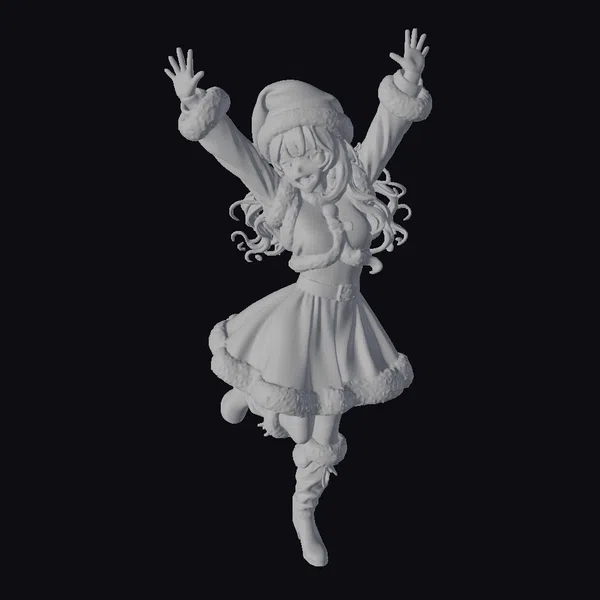 Detailed in a dynamic pose with arms raised, this anime-style Santa girl features long, curly brown hair and a bright smile. Her Santa outfit is richly detailed with white fur trim on her red dress, jacket, and hat, complemented by red boots. The model’s texture and shading give it a lively, cartoonish appearance. Ideal for use in animations, games, or as a decorative element in design projects, this model brings a touch of holiday spirit to any scene.