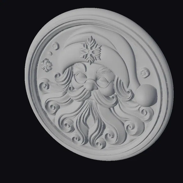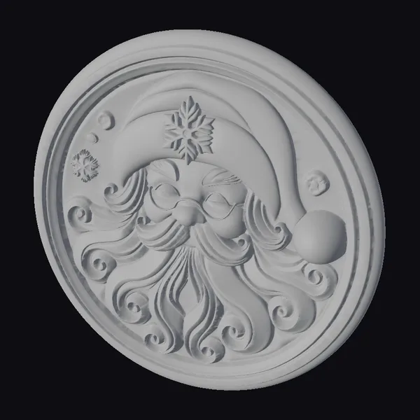 This captivating portrait of Santa Claus showcases the legendary figure in a stylized, cartoonish light. His face, framed by a majestic white beard with golden curls, is encircled by a red hat topped with a glittering silver snowflake. The image is set within a circular bronze-framed panel, which features a subtle green background adorned with small, intricate snowflakes. The level of detail is high, with Santa’s rosy cheeks and nose, paired with his eyeglasses, adding a touch of warmth. The overall design makes this model perfect for holiday-themed projects, such as animations, games, or 3D printing. Its stylized appearance allows for versatile use in various creative endeavors.