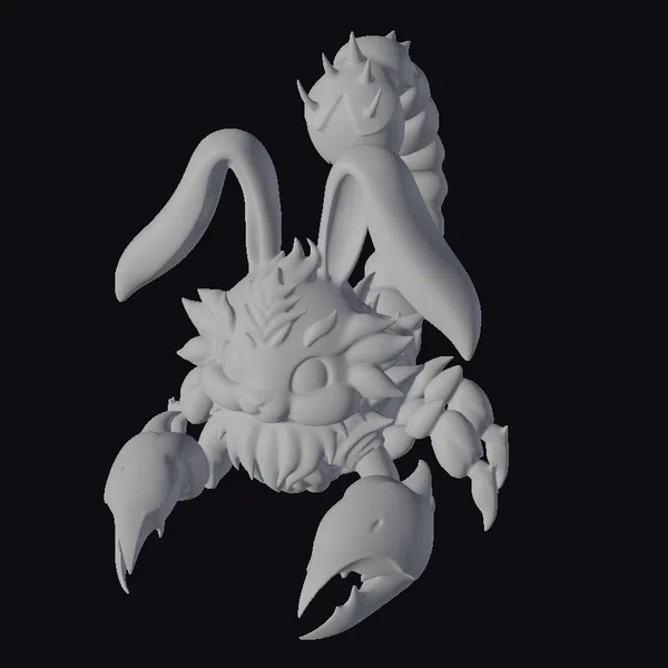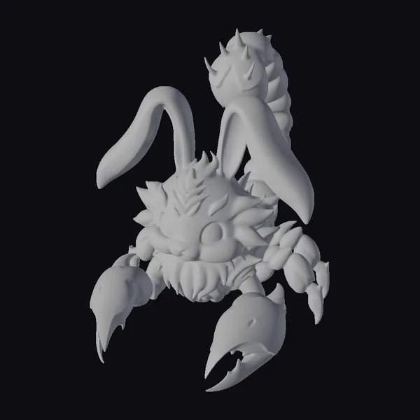 This stylized model presents a detailed, cartoon-like creature that combines the endearing features of a bunny with the formidable aspects of a scorpion. The bunny’s fluffy blue fur, long ears, and large, expressive eyes are meticulously rendered, while the scorpion’s tail, complete with a spiky, purple end, adds a touch of danger. The model showcases sharp, detailed claws and a textured, spiky body, all under vibrant lighting that highlights its multicolor appearance. Ideal for use in games, animations, or as a unique design element, this model is sure to stand out. Its playful yet edgy appearance makes it perfect for projects requiring a character that’s both cute and intriguing.