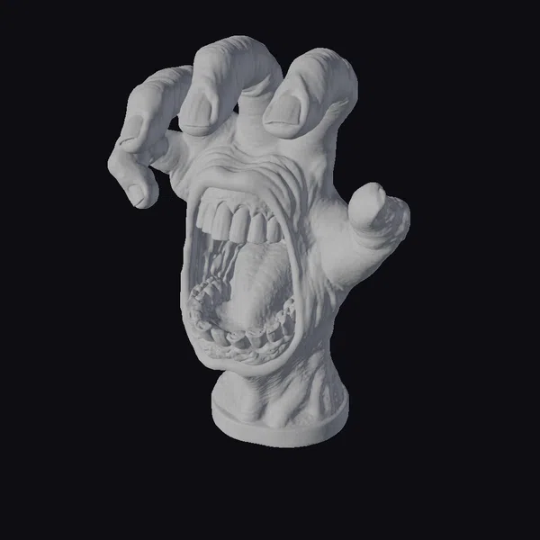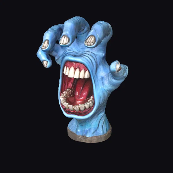 Gaze upon the eerie blue hand with an open mouth and sharp teeth, frozen in a terrifying scream. This stylized bust showcases a monster’s hand with fingers curled upwards, exuding a sense of horror and dread. The blue hue and detailed texture evoke a feeling of unease.