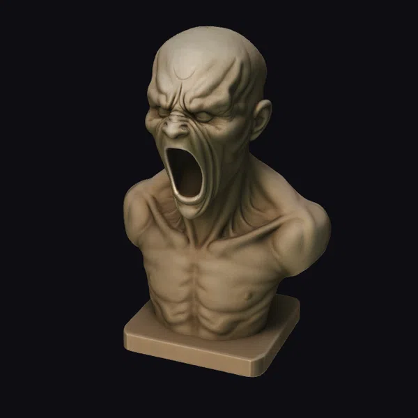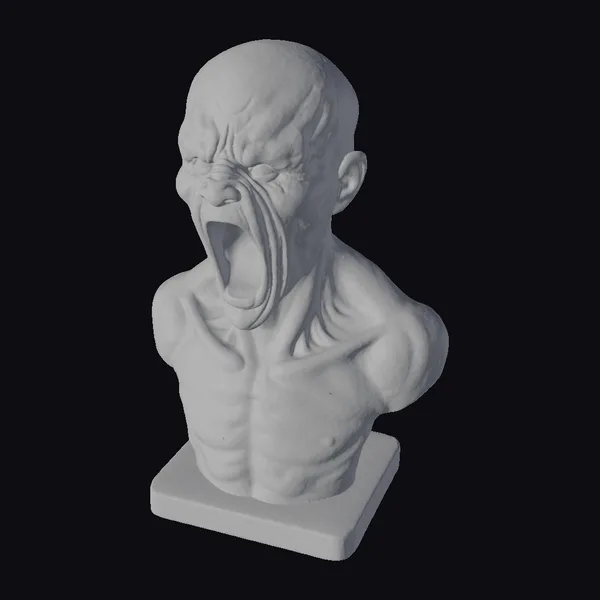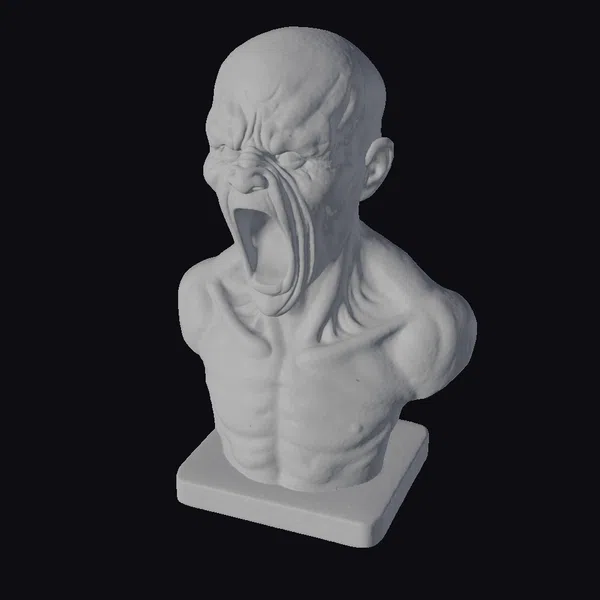 This striking bust model captures a muscular man in a moment of raw emotion, his face contorted in a scream. The realistic style and detailed texture bring a sense of intensity to the model, with visible muscles and veins adding to the lifelike appearance. The tan color finish gives the model a warm, earthy tone. Standing on a square base, this model is perfect for use in games, 3D printing, VR/AR experiences, animation, and design projects where a dramatic, emotive character is needed.