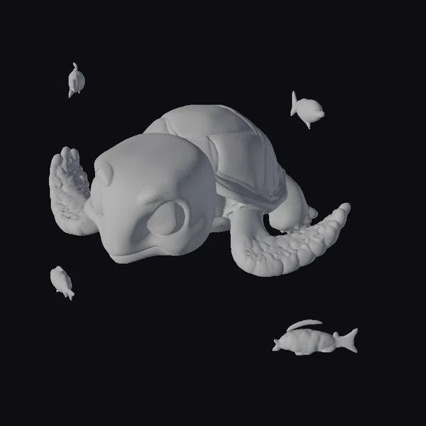 This stylized sea turtle model is captured in a dynamic swimming pose, complete with outstretched flippers and a shell that shimmers with a warm, golden glow. The turtle’s large, expressive eyes are a window to its friendly demeanor, inviting you to explore the depths with it. Surrounded by a school of small, orange fish, this scene is teeming with life and energy. Perfect for animators, game developers, and designers looking to bring a touch of whimsy to their projects, this model is versatile and ready for use in various applications, from children’s educational content to vibrant animations and 3D printed toys.