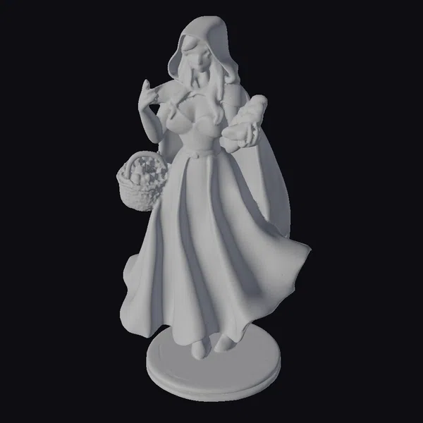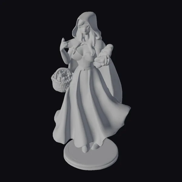 Standing on a sturdy wooden base, this stunning figurine of Red Riding Hood captures a serene moment as she takes a bite of bread, her eyes cast downward in contemplation. Her long, dark hair cascades down her back, complementing the vibrant red of her dress and hooded cape. The dress itself is a marvel of detailed design, with folds and creases that give it a lifelike appearance. In one hand, she holds a basket overflowing with an assortment of colorful goodies, while the other hand brings a crusty loaf of bread to her lips. The model’s stylized features enhance its appeal, making it a captivating addition to any collection. Whether for game development, animation projects, or as a decorative piece, this model is sure to impress with its blend of fantasy and realism.