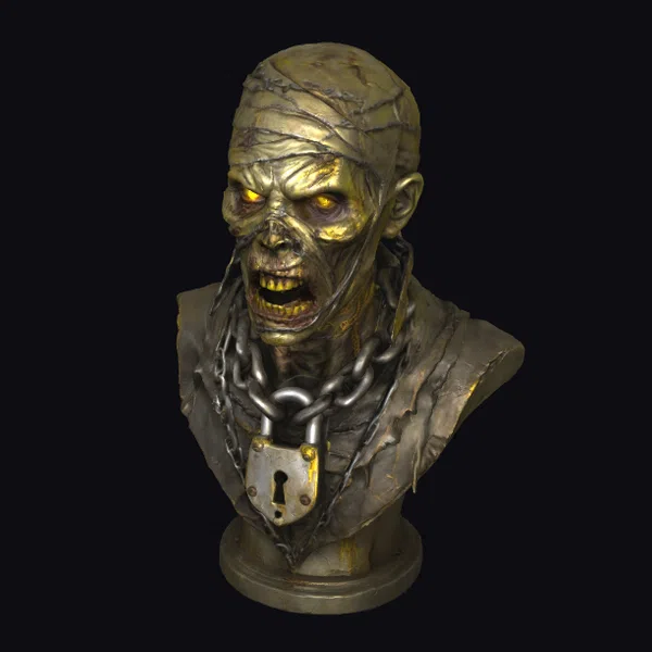 This detailed bust showcases a zombie with a uniquely golden complexion, its skin wrapped in thick, twisted metal chains that add to its terrifying appearance. A large, old padlock secures the chains around its neck, suggesting a history of captivity. The zombie’s eyes glow with an eerie yellow light, and its mouth is frozen in a snarl, revealing jagged teeth. The base of the bust is simple, allowing the focus to remain on the zombie’s gruesome details. This model is perfect for use in horror-themed games, animations, or as a striking piece of digital art. Its realistic style and attention to detail make it an excellent choice for projects requiring a high level of realism.