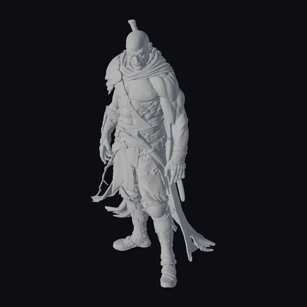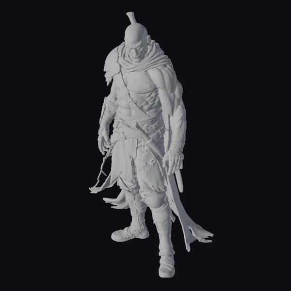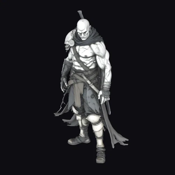Rendered in a stylized dark fantasy style, this muscular male warrior exudes a sense of brooding intensity. His bald head, accentuated by a series of scars crisscrossing his face and body, suggests a storied past of combat and hardship. Clad in tattered, dark clothing and armed with a large sword, he appears ready for battle. The detailed textures and dynamic pose make this model suitable for a variety of applications, including game development, animation projects, and visual effects. His design could inspire characters in dark fantasy settings, video games, or animated films.