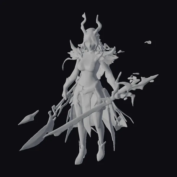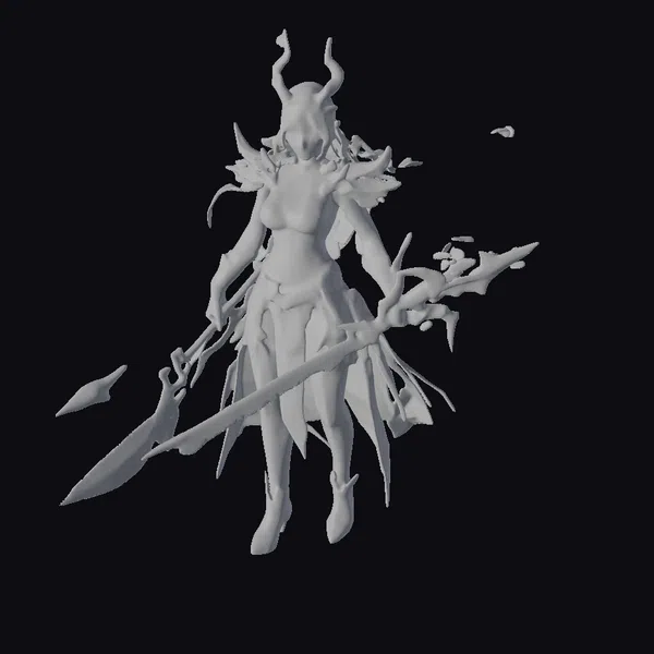 Standing tall with an imposing presence, this shadowy female warrior is a marvel of dark fantasy design. Her form is defined by a crackling void that seems to shift and writhe like living darkness, illuminated by glowing purple fissures that trace across her body. The effect is both captivating and intimidating, as if she’s a being from another realm. Her attire appears tattered and battle-worn, with shards of darkness fluttering around her like wisps of a shadowy aura. A pair of curved horns on her head add to her fearsome appearance, while her staff, a dark and twisted construct, seems to be an extension of her own power. This model is perfect for projects that demand a strong, mythical female presence, such as games, animations, or designs that venture into the realms of fantasy and the supernatural.