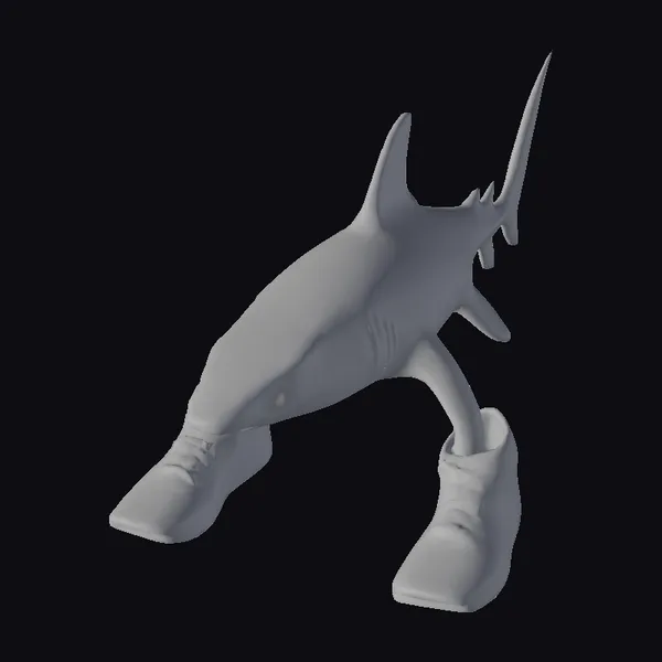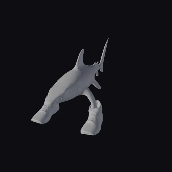 In a dynamic pose that captures a moment of playful curiosity, a gray shark is seen with its fins bent, as if trying on a pair of bright blue sneakers. The shark’s sleek body and sharp fins provide a striking contrast to the casual, sporty vibe of the sneakers. The blue shoes, with their detailed laces and white soles, add a pop of color to the scene. The stylized model showcases a blend of textures, from the smooth gray skin of the shark to the detailed fabric of the sneakers. This model is perfect for projects that require a touch of whimsy and humor, such as animations, games, or design projects aimed at a younger audience. Its unique blend of a wild animal and everyday fashion item makes it a versatile asset for creative projects.