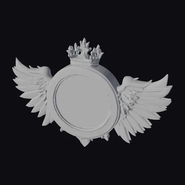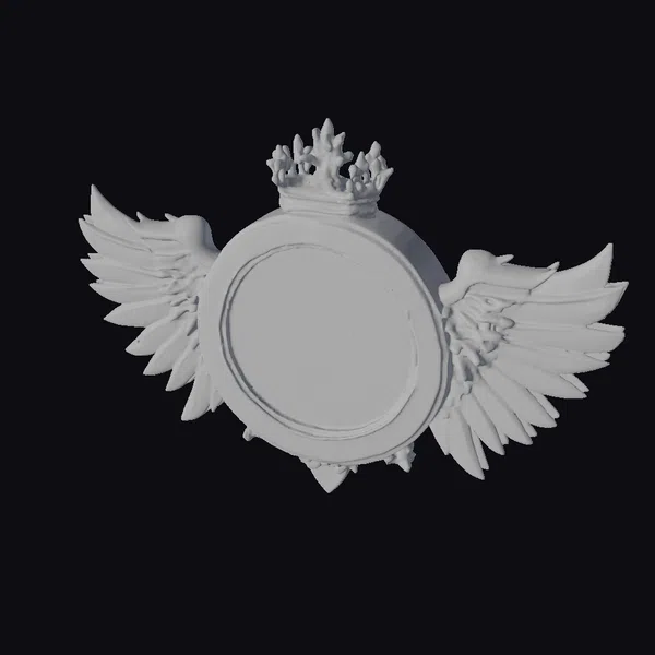 Suspended in mid-air, a shattered golden crown emblem showcases a fractured, glowing center, surrounded by a mosaic border and flanked by delicate wings. A crown sits atop this ornate piece, exuding a sense of former glory. The emblem’s cracked surface and jagged pieces floating around it tell a story of power lost. Its intricate details make it perfect for use in games, 3D printing, VR/AR experiences, animations, or designs where a touch of fantasy and decay is needed.