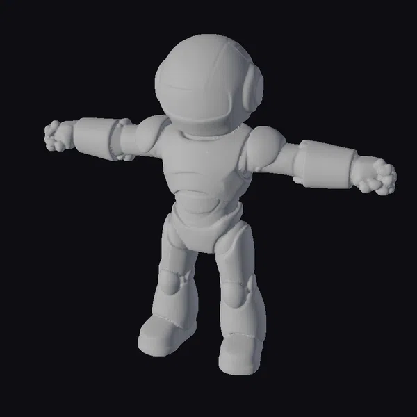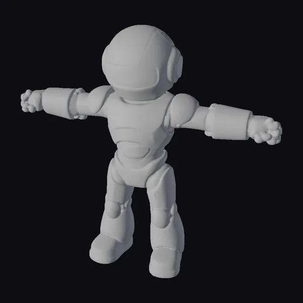Standing with its arms outstretched in a welcoming gesture, this stylized robot boasts a sleek, metallic body with a mesmerizing blue visor that glows with an inner light. The robot’s surface is a blend of smooth and detailed textures, with yellow stars marking its helmet and limbs. The blue accents on its head and the glowing eyes add a touch of whimsy and advanced technology. This model is perfect for projects requiring a friendly robotic character, suitable for animations, games, or virtual reality experiences where a charming, approachable robot is needed.