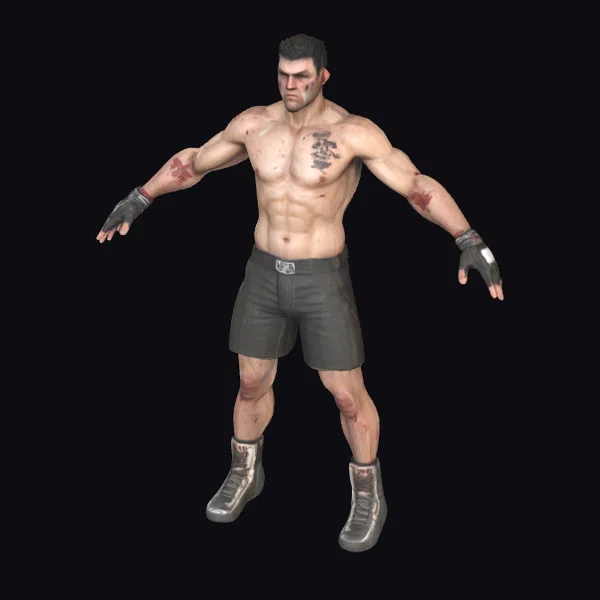 Standing with a powerful stance, this highly detailed 3D model of a shirtless MMA fighter showcases a physique honed from rigorous training and combat. His body is a canvas of battle scars, with cuts and bruises painting a vivid picture of his toughness. A distinctive tattoo on his chest adds a layer of character to his already imposing figure. His attire consists of black shorts with a silver buckle, fingerless gloves, and combat boots, completing his fighter look. This model is perfect for projects requiring a realistic and resilient character, such as game development, animation, and visual effects. Its high level of detail, especially in the facial features and musculature, makes it an excellent choice for any production aiming for realism.