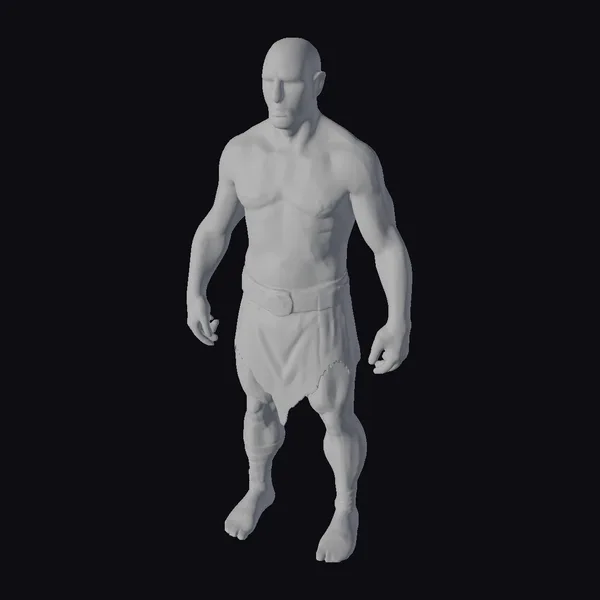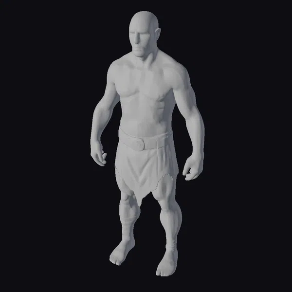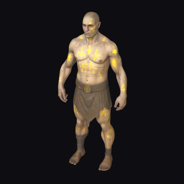 Standing in a powerful stance, this detailed 3D model of a shirtless male warrior showcases a muscular physique, accentuated by a bald head and a focused expression. The figure is adorned with a brown loincloth secured by a wide belt with a gold buckle, and brown boots that cover his feet and lower legs. The most striking feature, however, is the collection of glowing yellow runic marks dispersed across his skin, suggesting mystical powers or ancient runes. These marks catch the eye, adding a magical element to the character’s design. The model’s well-defined muscles and intense gaze convey a sense of strength and readiness for battle. Ideal for use in fantasy games, animations, or designs requiring a powerful, mystical character, this model brings a unique blend of realism and fantasy elements.