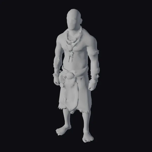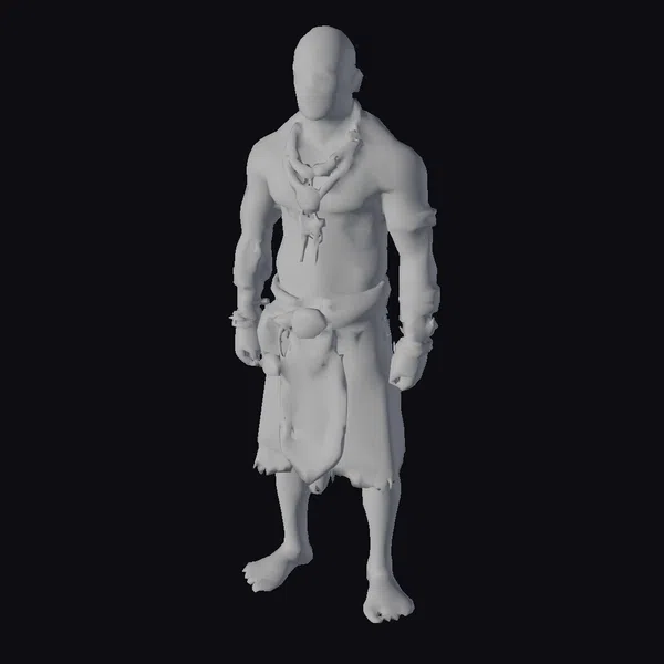 Standing with a commanding presence, this muscular, bald warrior is richly adorned with chunky jewelry and ornate accessories. His dark skin glistens with a subtle sheen, highlighting his defined physique. A variety of beads and metallic pieces encircle his neck, wrists, and arms, while a decorative cloth and leather belt cinch at his waist. The frayed edges of his black garment add a touch of ruggedness to his appearance. The intricate details of his accessories and the texture of his skin are meticulously rendered, making this character model a compelling addition to any project. Ideal for use in games, animations, or designs where a strong, tribal-inspired character is needed.