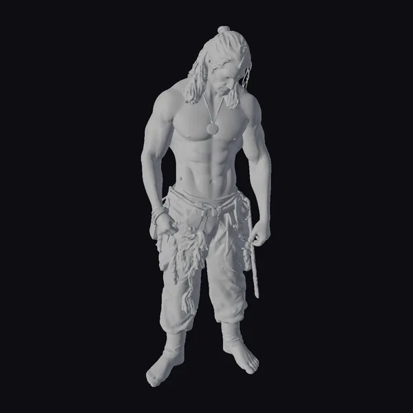 Rendered in exquisite detail, this character model showcases a muscular, shirtless warrior with a commanding presence. His gray hair is styled in a practical yet distinctive manner, pulled back to reveal a face marked by experience and resolve. The warrior’s physique is well-defined, with pronounced muscles suggesting a life of combat and physical toil. He wears dark pants that are tucked into brown boots, a simple yet functional outfit that speaks to his practical needs. A sword hangs at his side, an extension of his being and a testament to his readiness for battle. The model is meticulously textured, with attention to the play of light on his skin, the intricate details of his clothing, and the menacing yet elegant curve of his sword. This model would be a valuable asset for projects requiring a strong, realistic character, particularly in games, animations, or virtual reality experiences where detail and realism are paramount.