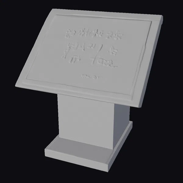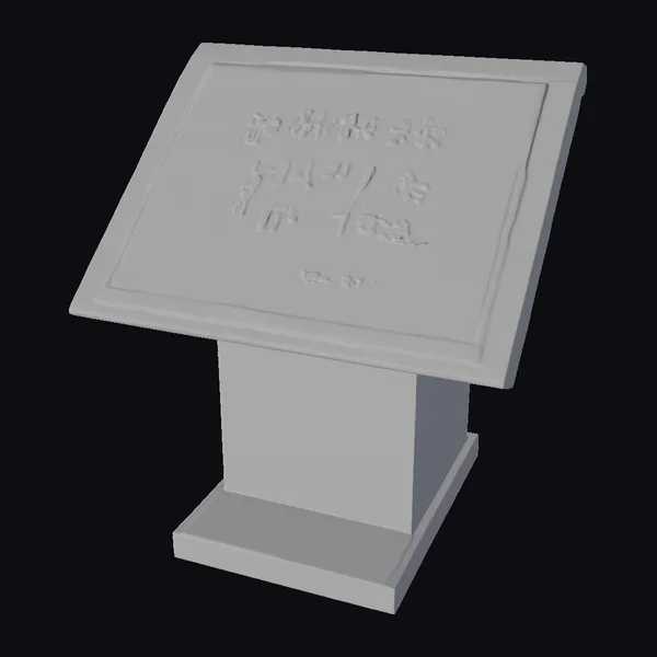 Crafted with meticulous attention to detail, this 3D model of a sign on a wooden stand presents a visually striking combination of materials and textures. The black sign, set within a wooden frame, is adorned with golden Asian characters that seem to shimmer in the light. The stand, with its robust wooden base and column, provides a sturdy foundation for the sign, which is angled to suggest dynamic movement. The dark wood grain of the stand and frame adds a tactile quality, suggesting the warmth and natural beauty of real wood. This model is perfect for designers and creators looking to add a touch of cultural elegance or mystery to their projects, whether for games, print, VR/AR experiences, animation, or design concepts.