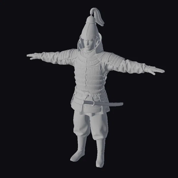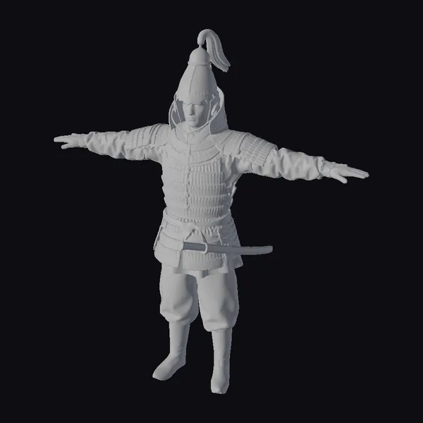 Gaze upon the imposing figure of a Silla warrior, clad in intricately designed armor that speaks to the rich history of Korea’s ancient dynasties. The armor’s chest plate and shoulder guards are crafted with precision, showcasing a complex pattern that highlights the artisan’s skill. A red crest atop the helmet adds a pop of color, symbolizing the warrior’s status or allegiance. The armor’s earthy tones, complemented by the vibrant orange sash and the sheathed sword at the warrior’s side, create a visually stunning ensemble. This model is perfect for projects requiring a historically inspired, detailed character model, such as games, animations, or historical reconstructions. Its detailed design and realistic proportions make it an excellent choice for any creative project aiming to capture the essence of ancient Korean history.