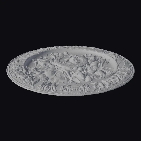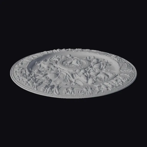 Positioned dynamically against a neutral backdrop, the silver relief plate showcases a mesmerizing array of mythological scenes, meticulously crafted to transport the viewer to a bygone era. The plate’s circular form is divided into distinct sections, each containing a unique narrative or figure, rendered in exquisite detail. The central motif features a prominent figure surrounded by radiating patterns and figures, all cast in high relief. The outer rim of the plate is equally ornate, with a sequence of interconnected scenes that appear to unfold like a frieze. This 3D model, with its rich textures and nuanced lighting, is poised to elevate any digital environment, from architectural visualizations to video games and animations. Designers and artists will appreciate the plate’s potential as a detailed prop or set dressing element, capable of adding depth and authenticity to their projects.