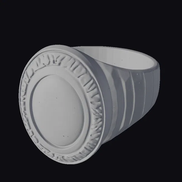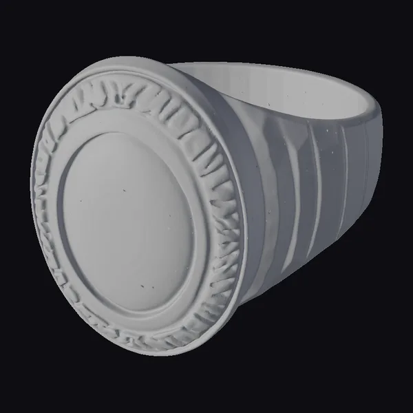 Positioned at an angle, this exquisitely detailed silver ring showcases a large, dark black gemstone encircled by an ornate metal border. The ring’s band features a series of raised, parallel lines that add texture and visual interest. The gemstone’s dark hue provides a striking contrast to the ring’s metallic sheen, making it a standout piece. The level of detail in this model makes it perfect for use in high-end jewelry design, advertising, or even 3D printing. Its realistic appearance and intricate details make it an excellent choice for designers and artists looking to add a touch of luxury to their projects.