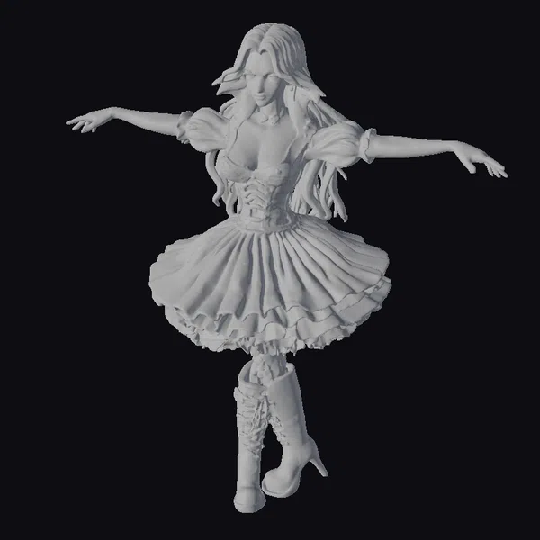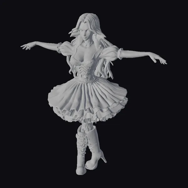 Floating dynamically in mid-air, the skeletal ballerina exudes an eerie elegance. Her long, dark hair cascades down her back like a waterfall of night, contrasting with the stark white of her skeletal frame. The black tutu, adorned with layers of delicate ruffles, appears to be swirling around her, as if caught in a ghostly whirlwind. Her knee-high boots, complete with skeletal designs, add a touch of macabre whimsy. This model is perfect for use in games, 3D printing, VR/AR experiences, animation, and design projects, particularly those with a dark, gothic, or fantastical theme.