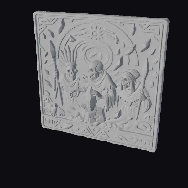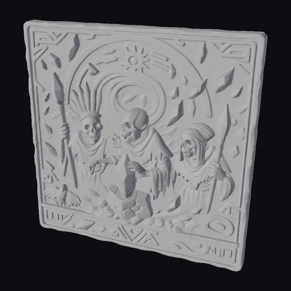 In a stunning display of fantasy artistry, this 3D model depicts three skeletal figures standing sentinel around a radiant crystal. The intricate relief sculpture showcases the skeletal guardians in exquisite detail, their skeletal faces contorted in a snarl as they grasp their spears. The tan stone used to craft this monumental piece adds warmth to the overall design, while the tattered robes and bony fingers convey a sense of eerie realism. The crystal at the center of the composition pulsates with an ethereal energy, as if imbuing the skeletal guardians with an unholy power. A halo of light surrounds the crystal, casting an otherworldly glow on the surrounding stone. This 3D model is perfect for use in games, 3D printing, VR/AR experiences, animation, and design projects, where a touch of dark fantasy is required.