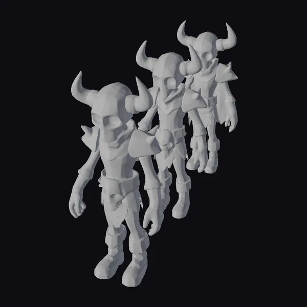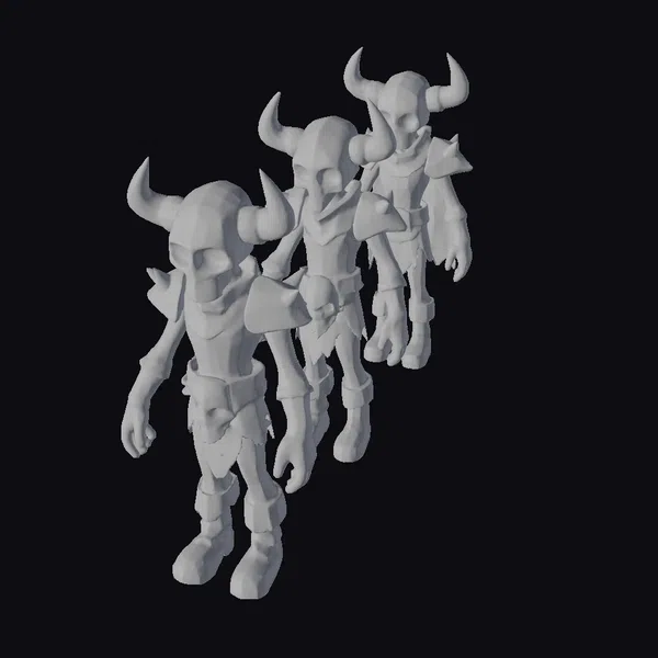 Detailed with precision, these three skeleton warriors stand poised, each one unique in stance and appearance. Their skeletal bodies are wrapped in tattered, earth-toned armor, complete with horned skull headpieces and dark, empty eye sockets. The central figure grasps a smaller skull, adding to the macabre tableau. These models are meticulously crafted with a focus on detail, from the texture of their bony skin to the weathering of their armor. Ideal for use in dark fantasy settings, horror-themed projects, or any creative endeavor requiring a touch of the macabre. They can be used in games, 3D printing, VR/AR experiences, animation, and design projects to add a haunting element.