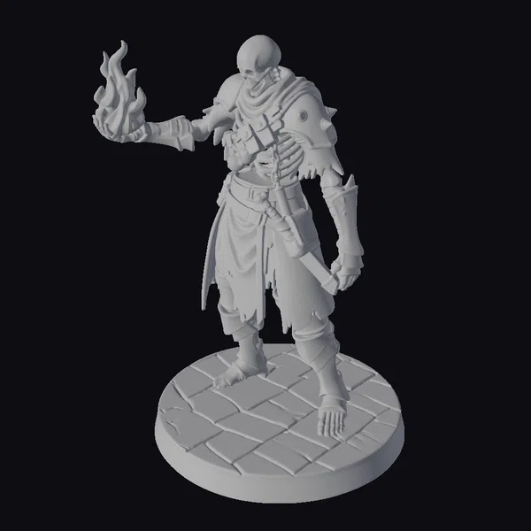Standing atop a weathered stone base, this skeletal sorcerer is poised in a dynamic stance, as if ready to unleash his magical fury upon the world. The fireball in his hand crackles with vibrant, orange flames, casting a warm glow on the dark, metallic armor that adorns his bony frame. The armor itself appears worn and battle-worn, with tattered edges and a sense of history that speaks to countless battles fought and won. As a 3D model, this character is primed for use in a variety of creative projects, from game development and animation to architectural visualization and graphic design. Whether you’re crafting a dark fantasy realm or a gothic-inspired art piece, this skeleton warrior is sure to cast a lasting impression.