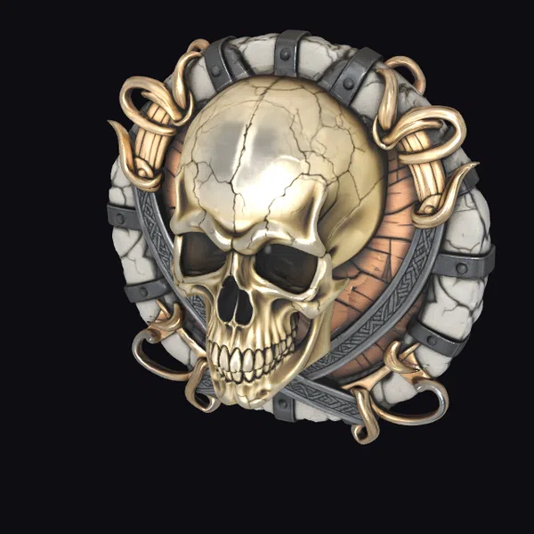 The Skull Swords Emblem presents a striking visual with its cracked gold skull positioned front and center, surrounded by intricately twisted metal swords that add a sense of dynamic movement. The emblem’s base is a masterful blend of weathered stone and metal textures, giving it an ancient, battle-worn appearance. The gold skull, with its deep crevices and cracks, seems to glow with an inner light, drawing the viewer’s eye. The combination of dark fantasy elements, including the skull and the metallic sheen of the swords, creates a mood that is both ominous and intriguing. This emblem would be a fantastic addition to any project requiring a dark, fantastical element, such as games, animations, or designs aimed at a mature audience. Its detailed craftsmanship and unique blend of materials make it a standout piece.